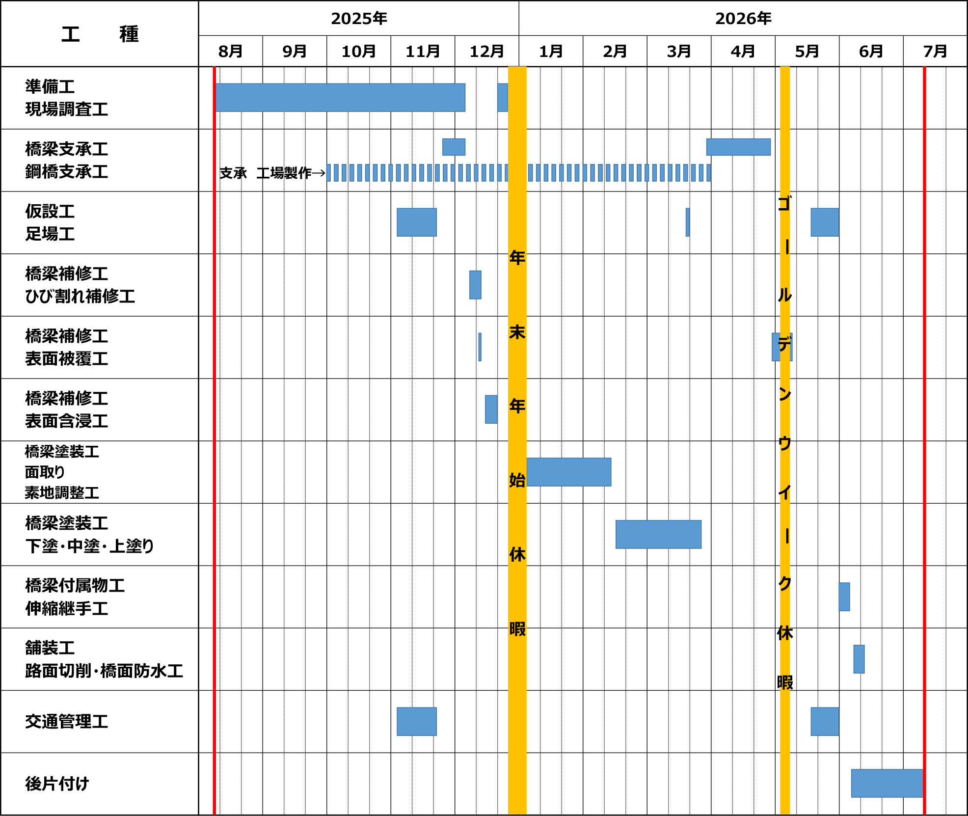 橋梁塗装工、伸縮継手工、舗装工、足場工